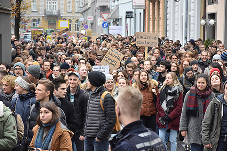Konstanz (gro) Zu Tausenden sind am Dienstag in Konstanz Studierende und Hochschullehrer auf die Strasse gegangen, um gegen den anhaltenden Stuttgarter Geiz zu protestieren, der zu einer chronischen Unterfinanzierung der baden-württembergischen Universitäten und Hochschulen geführt hat. Der Protest richtete sich sowohl gegen die Grün-Schwarze Landesregierung unter Ministerpräsident Winfried Kretschmann als auch gegen die Mitglieder des Landesparlaments, die den rigiden Sparkurs der Regierung abgesegnet haben. Kerstin Krieglstein griff den Stuttgarter Sparkurs scharf an: Das Land, so sagte die Rektorin der Bodenseeuniversität bei der Schlusskundgebung auf dem Augustinerplatz, habe „die akademische Bildung in den vergangenen 20 Jahren kaputtgespart“. … weiterlesen \"\"