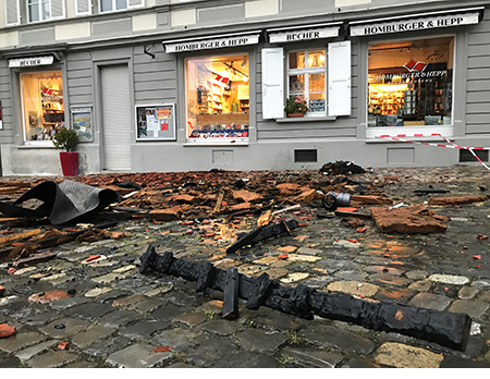 Konstanz (gro) Schreck in der Abendstunde: Blitzende Blaulichter, mit Scheinwerfern bestückte Drehleitern, behelmte Feuerwehrleute, Polizeibeamte, Zurufe, Kommandos der herbei geeilten Helfer und das Ausbringen von Wasserschläuchen haben die Nordseite des Münsterplatzes gestern Abend kurz nach 17.30 Uhr vorübergehend in einen organisierten Hexenkessel verwandelt. Die Rettungskräfte waren zum Haus Münsterplatz 7 gerufen worden, weil Rauch aus dem Dach, drei Stockwerke hoch über der Buchhandlung Homburger & Hepp, drohend emporstieg. Wenig später schlugen meterhohe Flammen durch. Das rasche, beherzte Eingreifen der Feuerwehr verhinderte Schlimmeres: Verletzt wurde niemand, und auch der Schaden am ehemaligen Domherrenhaus des Chorstifts St. Johann dürfte sich in relativ erträglichen Grenzen bewegen. … weiterlesen \"\"